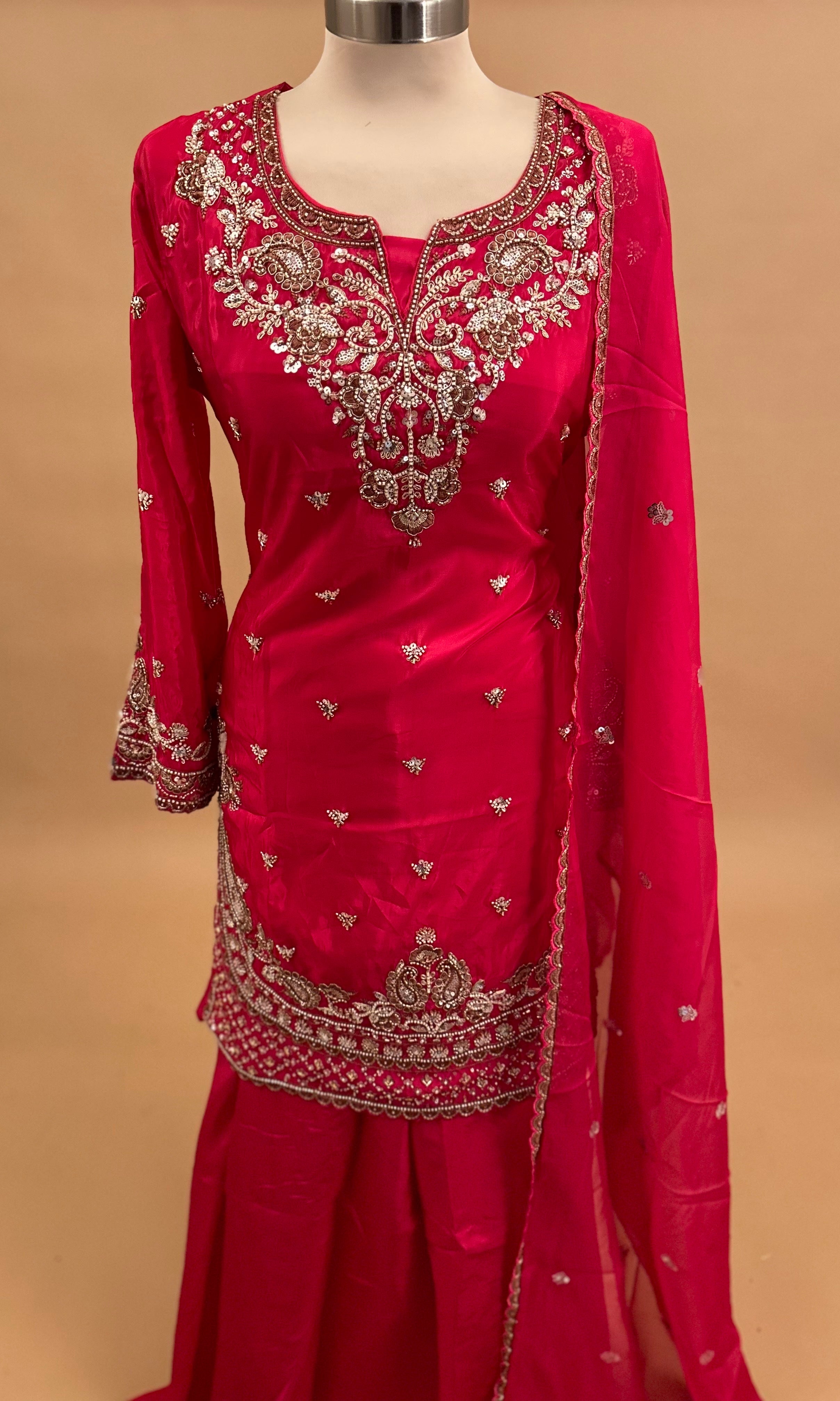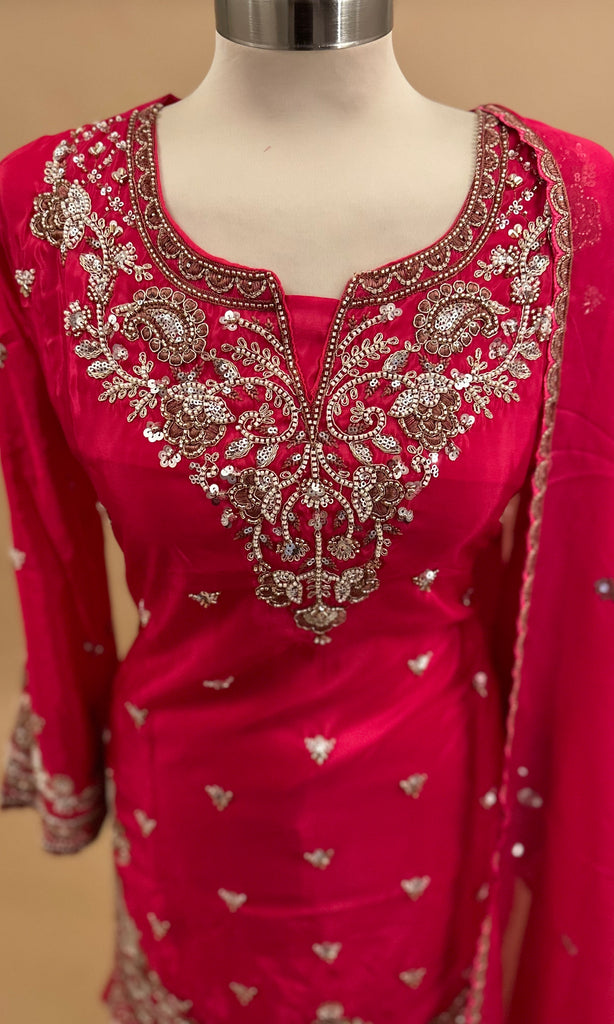 Elevate your festive wardrobe with this stunning hand-embroidered palazzo suit, meticulously crafted for special occasions. The rich Pinkish Red hue radiates warmth and elegance, while intricate beadwork and stone embellishments add sophisticated dimension to the ensemble. Tailored from premium chinon fabric, this lightweight yet structured material drapes beautifully and ensures all-day comfort. The coordinating dupatta completes the look with graceful movement and traditional charm. Perfect for weddings, celebrations, and formal gatherings, this piece combines artisanal craftsmanship with contemporary silhouettes for a truly memorable appearance.