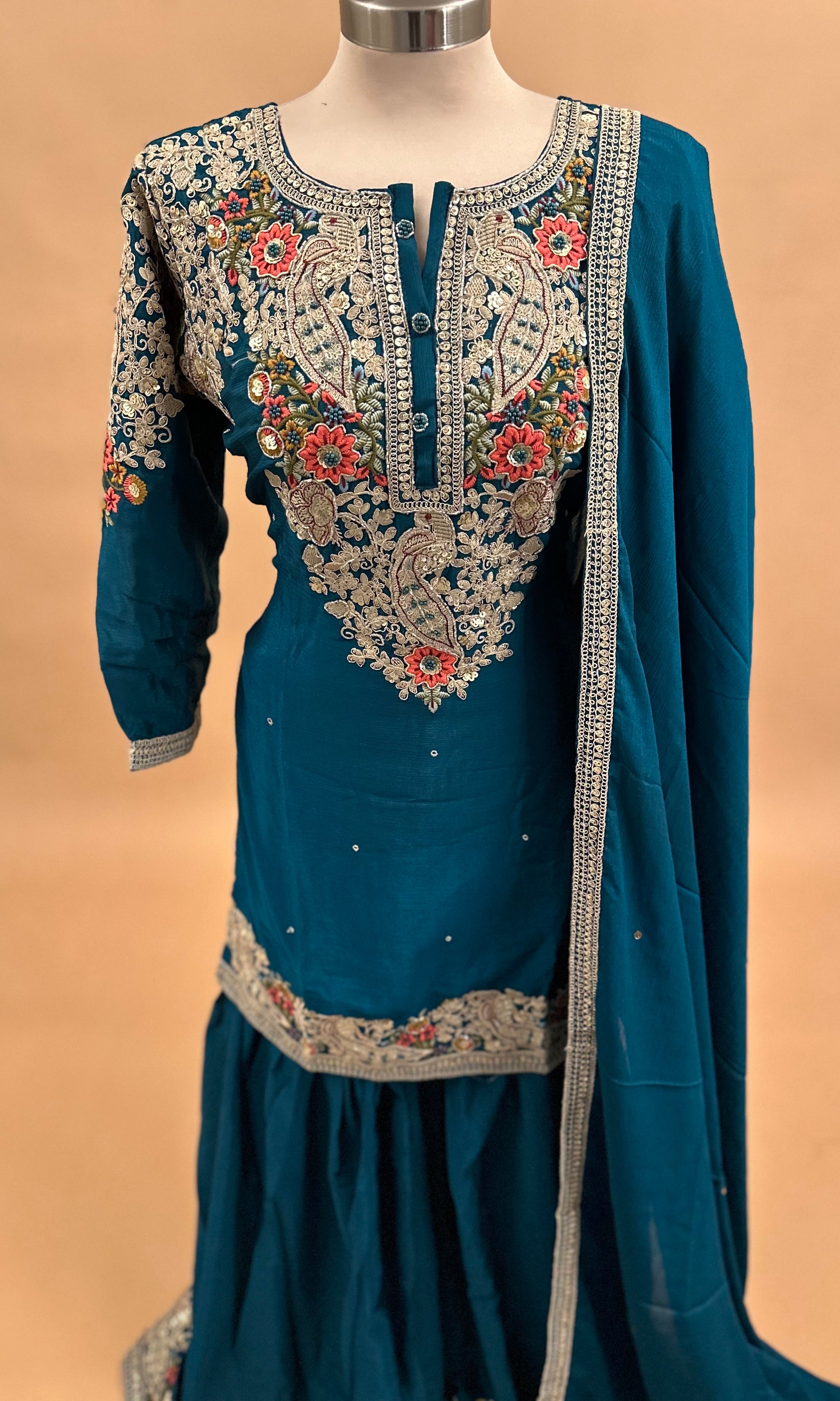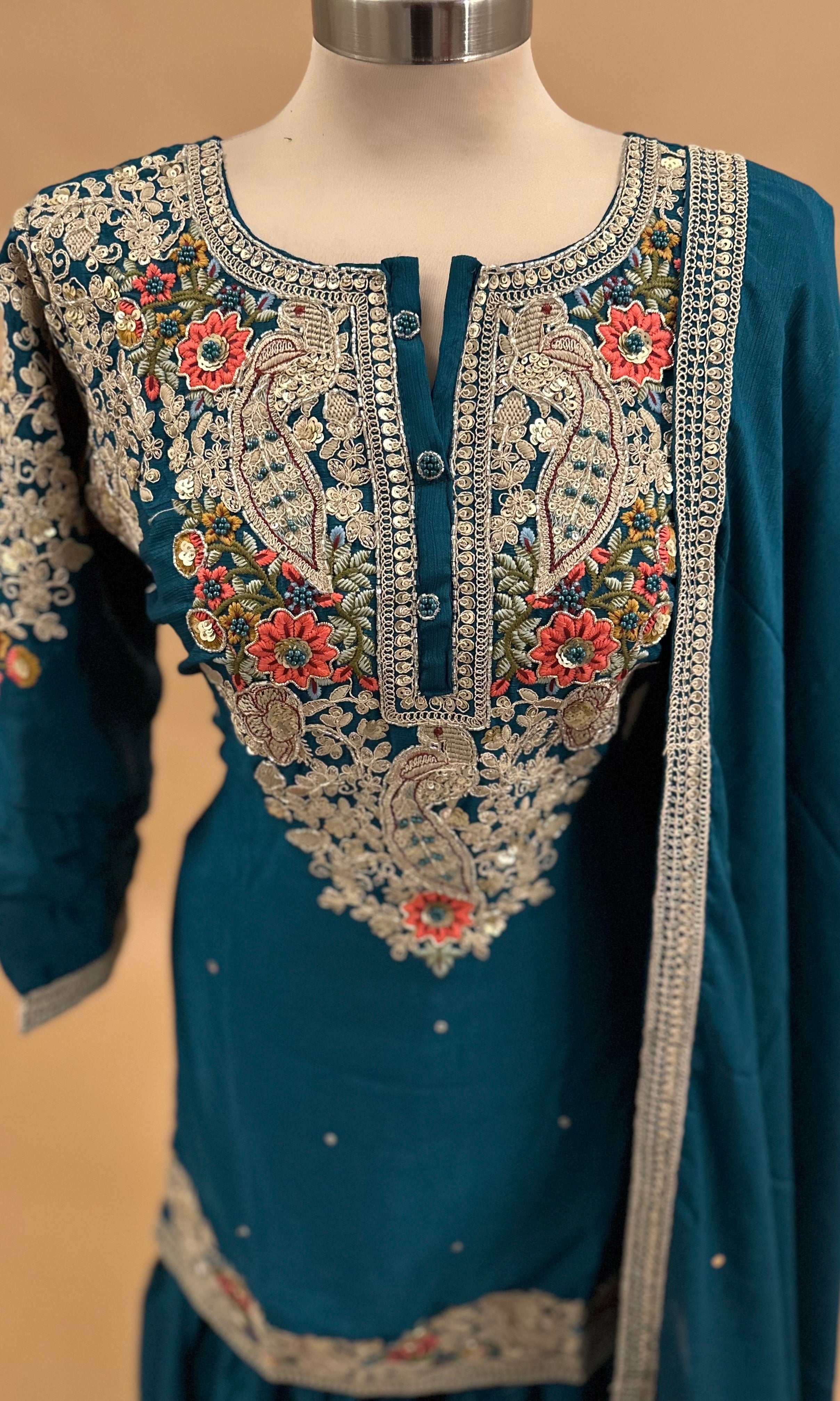 Elevate your festive wardrobe with this stunning teal sharara suit, expertly crafted from lightweight chinon fabric for all-day comfort. The ensemble features intricate sequin embroidery that catches light beautifully, creating an elegant shimmer perfect for celebrations and special occasions. The coordinated dupatta completes the sophisticated look with traditional charm. Ideal for weddings, parties, and cultural events, this piece combines timeless design with contemporary flair, ensuring you stand out with grace and style.