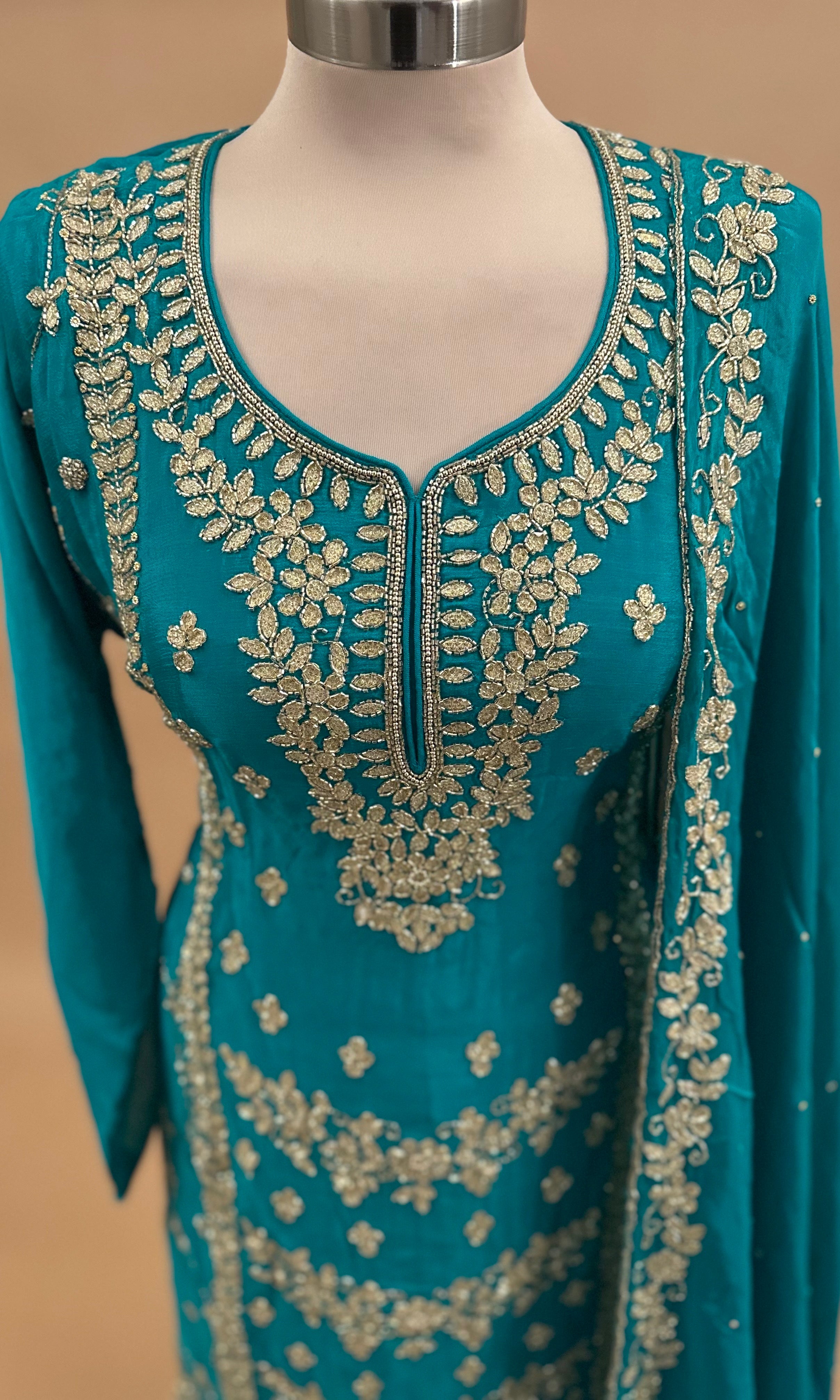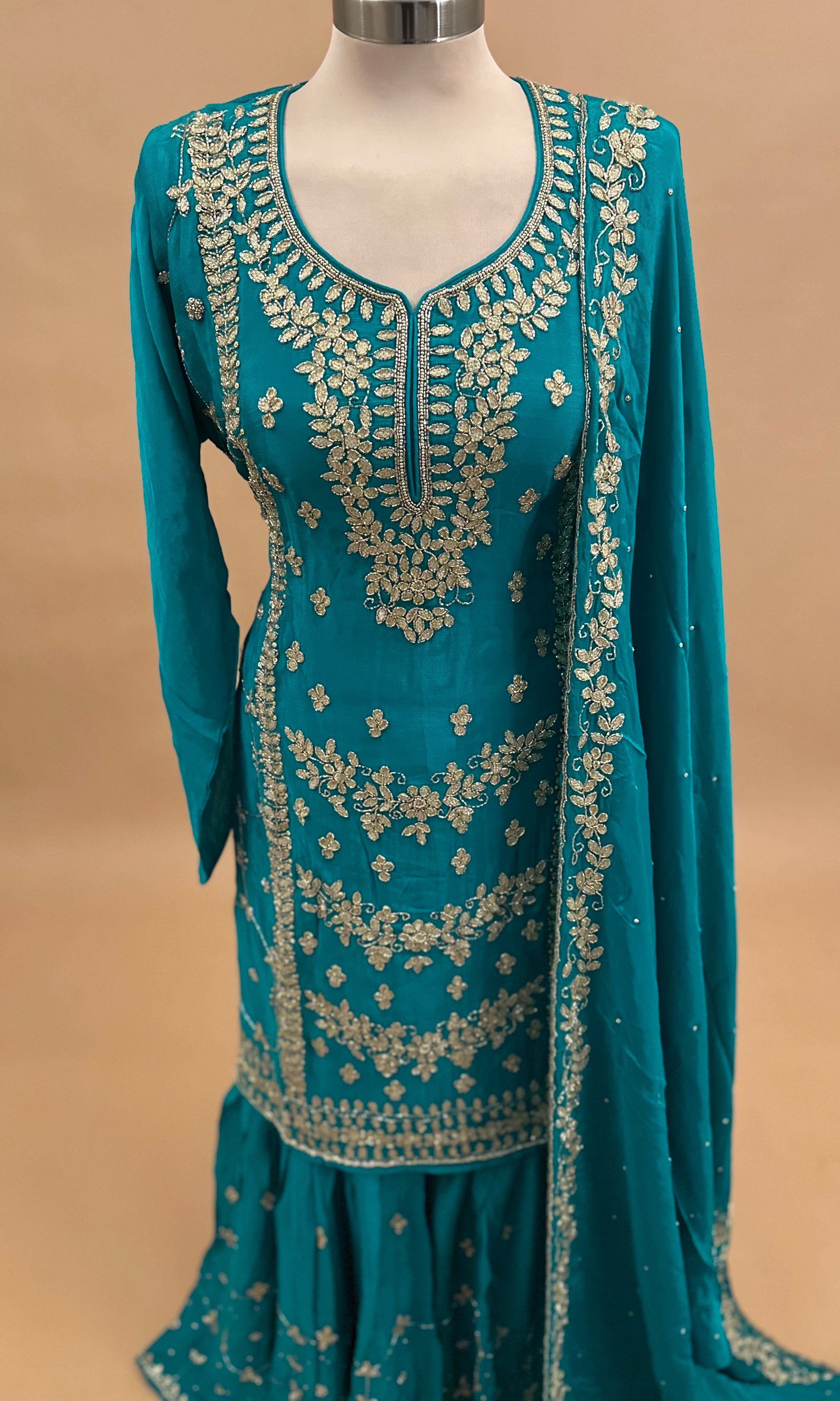 Elevate your ethnic wardrobe with this exquisite Pakistani sharara suit, meticulously crafted in luxurious chinon fabric. The ensemble features intricate beadwork embroidery in striking Turquoise Blue, creating a sophisticated and eye-catching design perfect for weddings, celebrations, and formal occasions. The sharara's flowing silhouette offers graceful movement and comfort, while the coordinating dupatta adds an elegant finishing touch. This traditional piece combines timeless craftsmanship with refined aesthetics, making it an ideal choice for those seeking authentic Pakistani fashion with contemporary appeal.