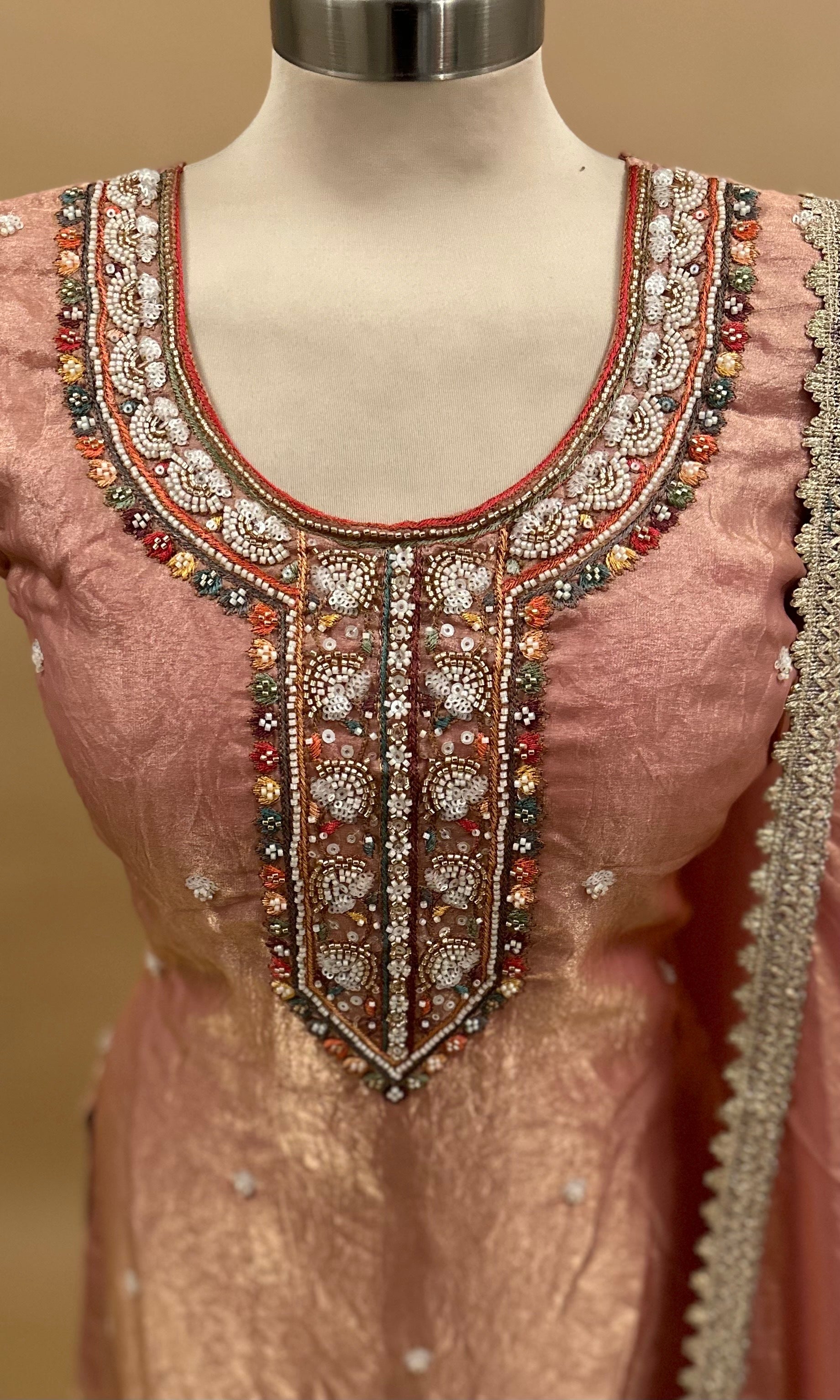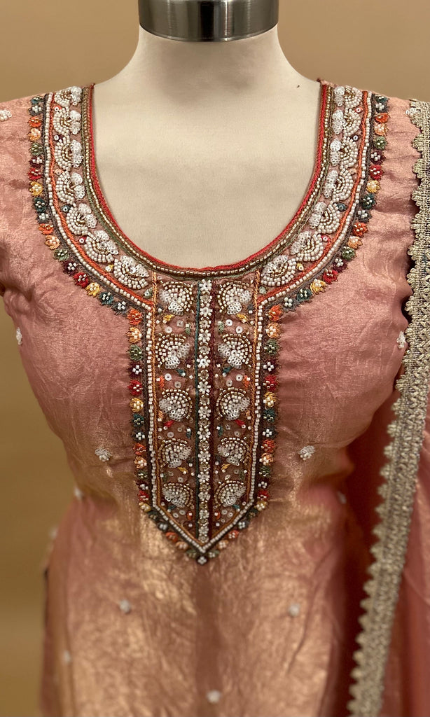 This peach-colored palazzo suit crafted from lightweight tissue fabric offers both elegance and comfort. Detailed with delicate bead embroidery, it adds a subtle shine that enhances its sophisticated look. The set includes a matching dupatta, completing the ensemble with grace and versatility for various occasions. Ideal for warm weather, its breathable fabric ensures ease of wear throughout the day.