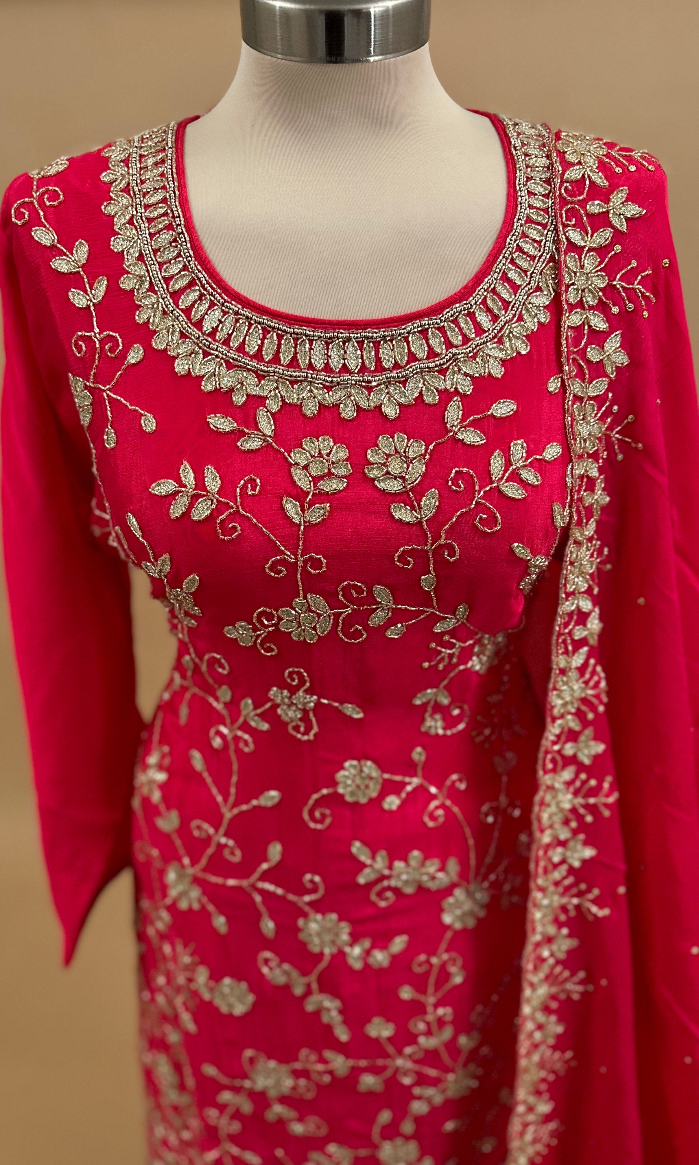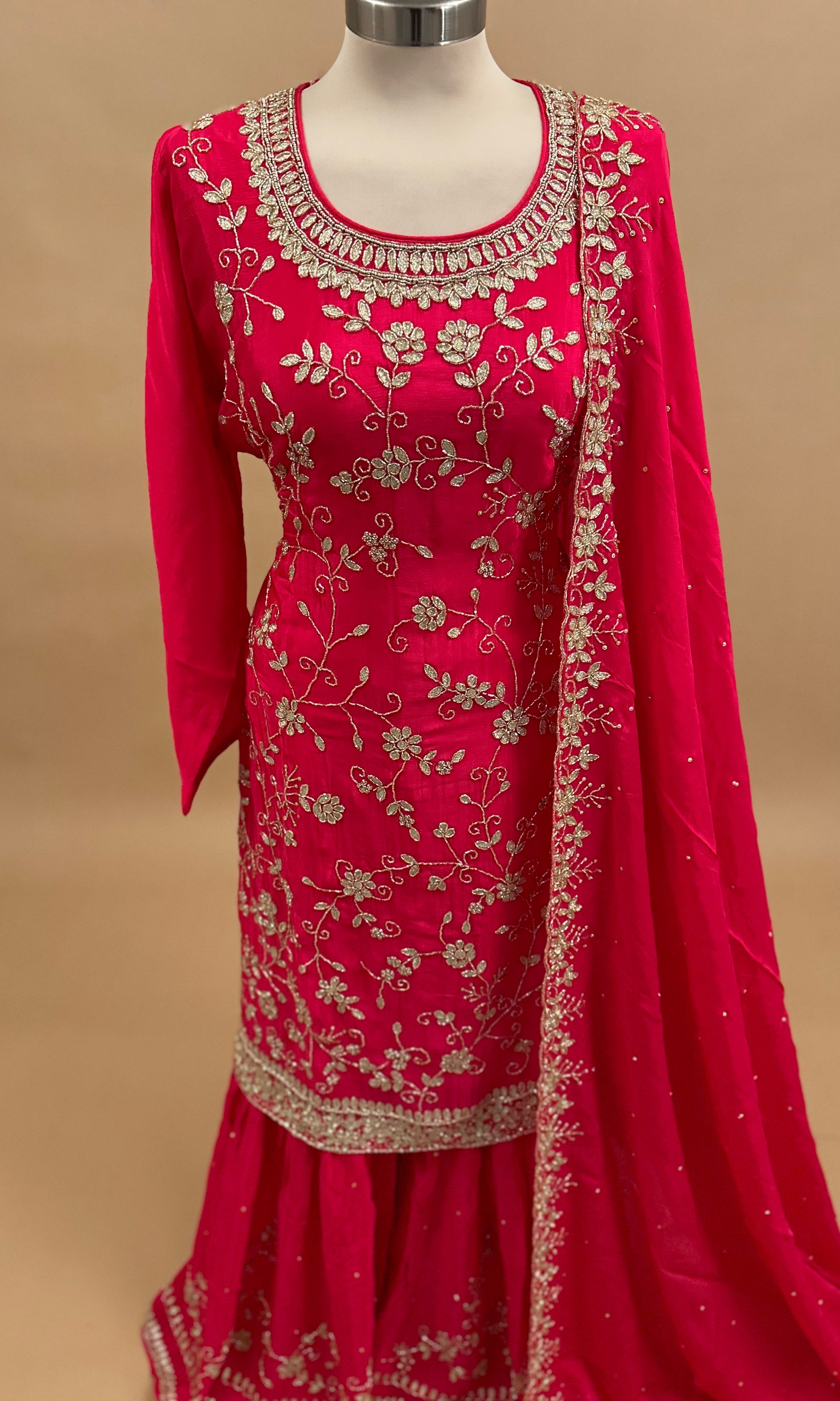 Elevate your ethnic wardrobe with this exquisite Pakistani sharara suit, meticulously crafted in luxurious chinon fabric. The ensemble features intricate beadwork embroidery in striking Pink , creating a sophisticated and eye-catching design perfect for weddings, celebrations, and formal occasions. The sharara's flowing silhouette offers graceful movement and comfort, while the coordinating dupatta adds an elegant finishing touch. This traditional piece combines timeless craftsmanship with refined aesthetics, making it an ideal choice for those seeking authentic Pakistani fashion with contemporary appeal.
