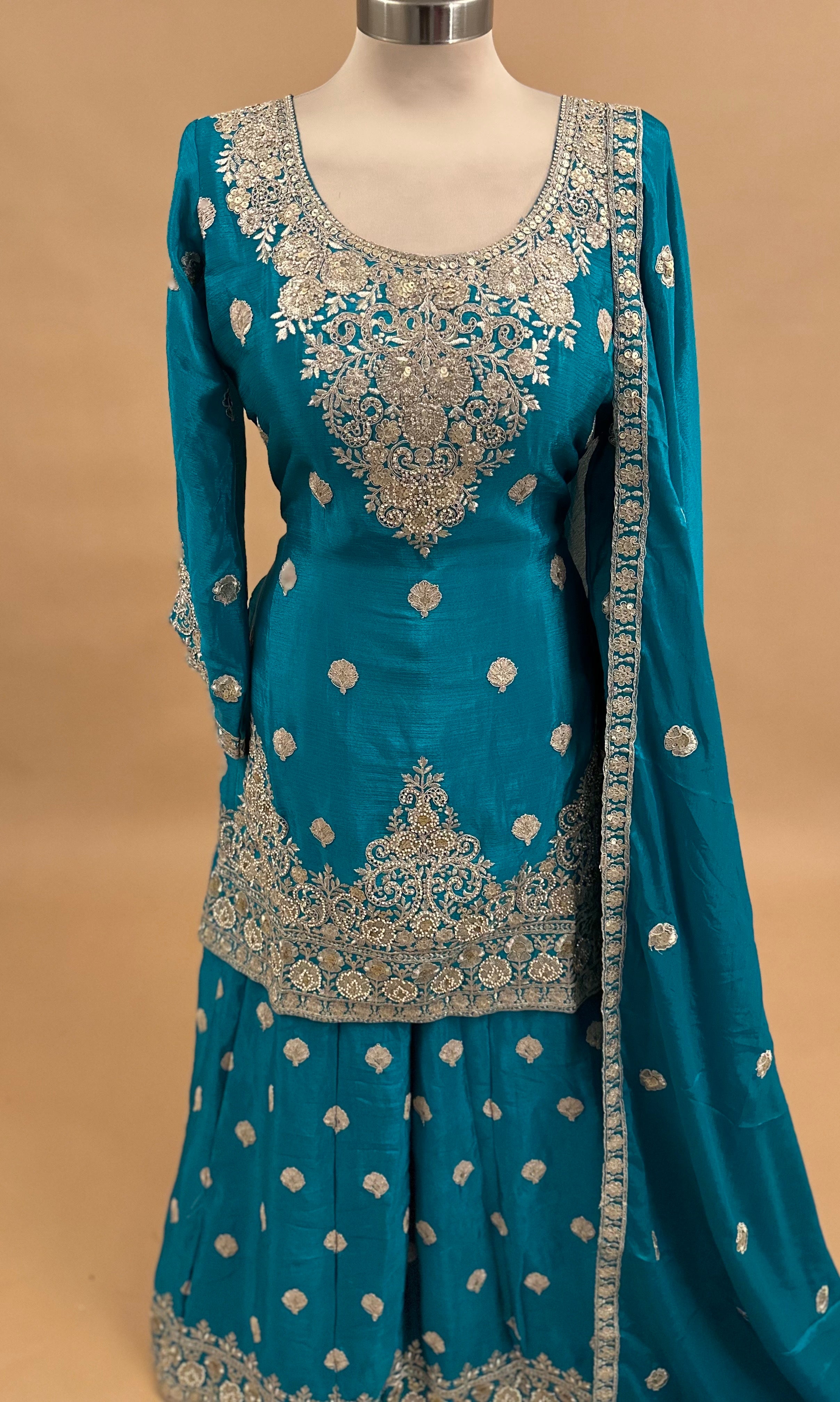 Elevate your party wardrobe with this stunning Turquoise Blue palazzo suit, meticulously crafted from premium chinon fabric. The ensemble features intricate stone work embroidery that adds sophisticated elegance to the traditional silhouette. The coordinating dupatta completes the look with refined grace. Perfect for weddings, celebrations, and formal gatherings, this piece combines timeless design with quality craftsmanship. The breathable chinon fabric ensures comfort throughout your event, while the detailed embellishments showcase expert artistry. An ideal choice for those seeking polished, statement-making ethnic wear.