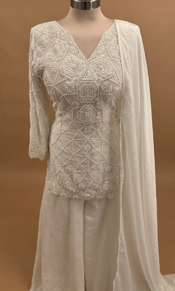 Beads Work Light Weight Short Kameez Palazzo Suit White Color With Dupatta