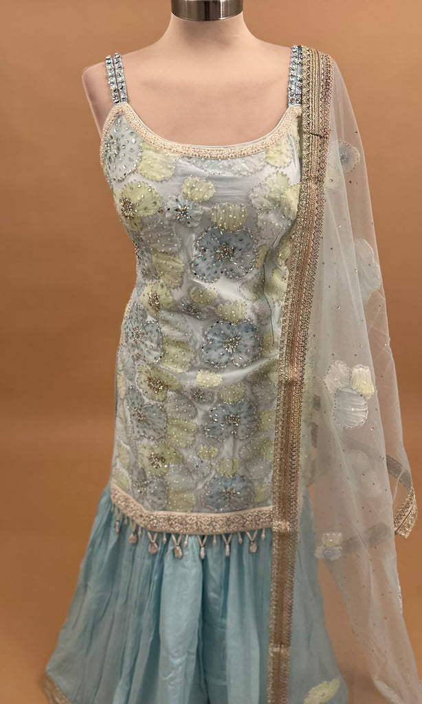 Blue Color Contrast Heavy Sharara Suit On Georgette Fabric With Full Dupatta