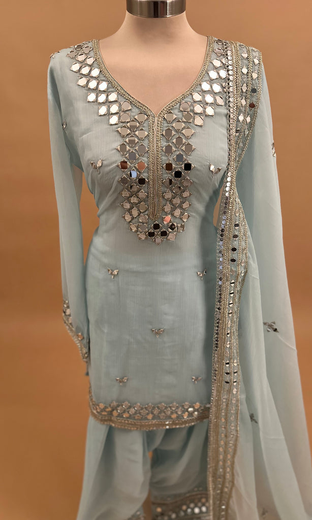 Blue Color Elegant Style Mirror Work Embroiderey Farshi Pant Suit With Dupatta