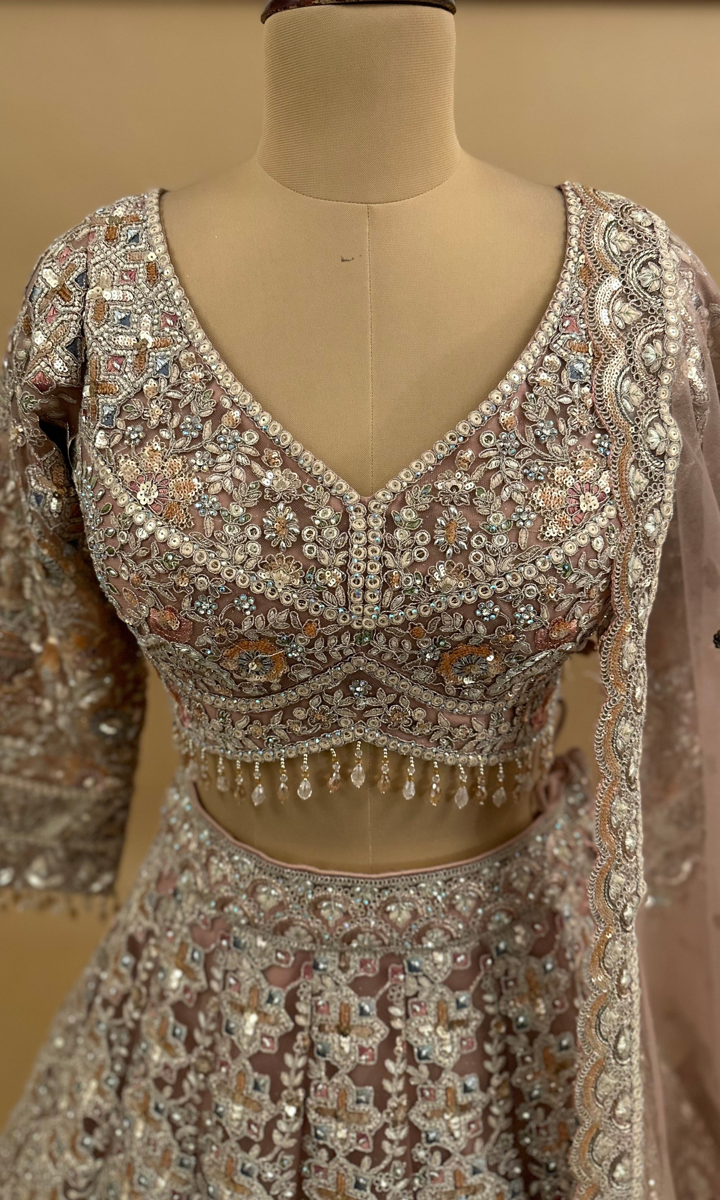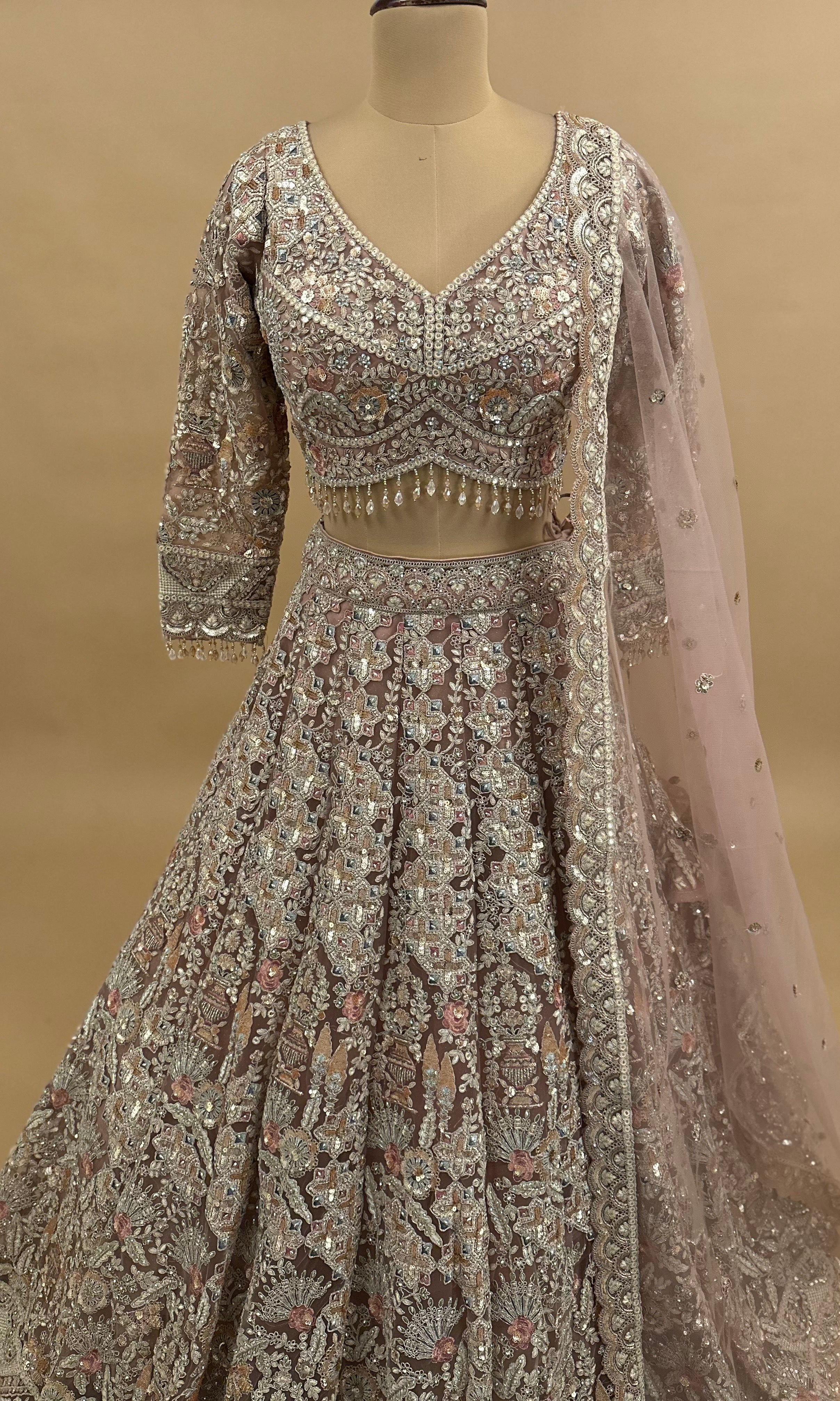 Elevate your festive wardrobe with this stunning light rose gold lehenga choli set, expertly crafted for those special occasions. The ensemble features intricate mirror and stone embroidery work that catches light beautifully, creating an elegant shimmer throughout. Constructed from premium net fabric, this three-piece set includes the lehenga, choli blouse, and coordinating dupatta. The sophisticated rose gold hue complements a variety of skin tones, while the detailed embellishments showcase traditional craftsmanship. Perfect for weddings, celebrations, and formal events, this heavy party wear piece combines timeless design with contemporary appeal.
