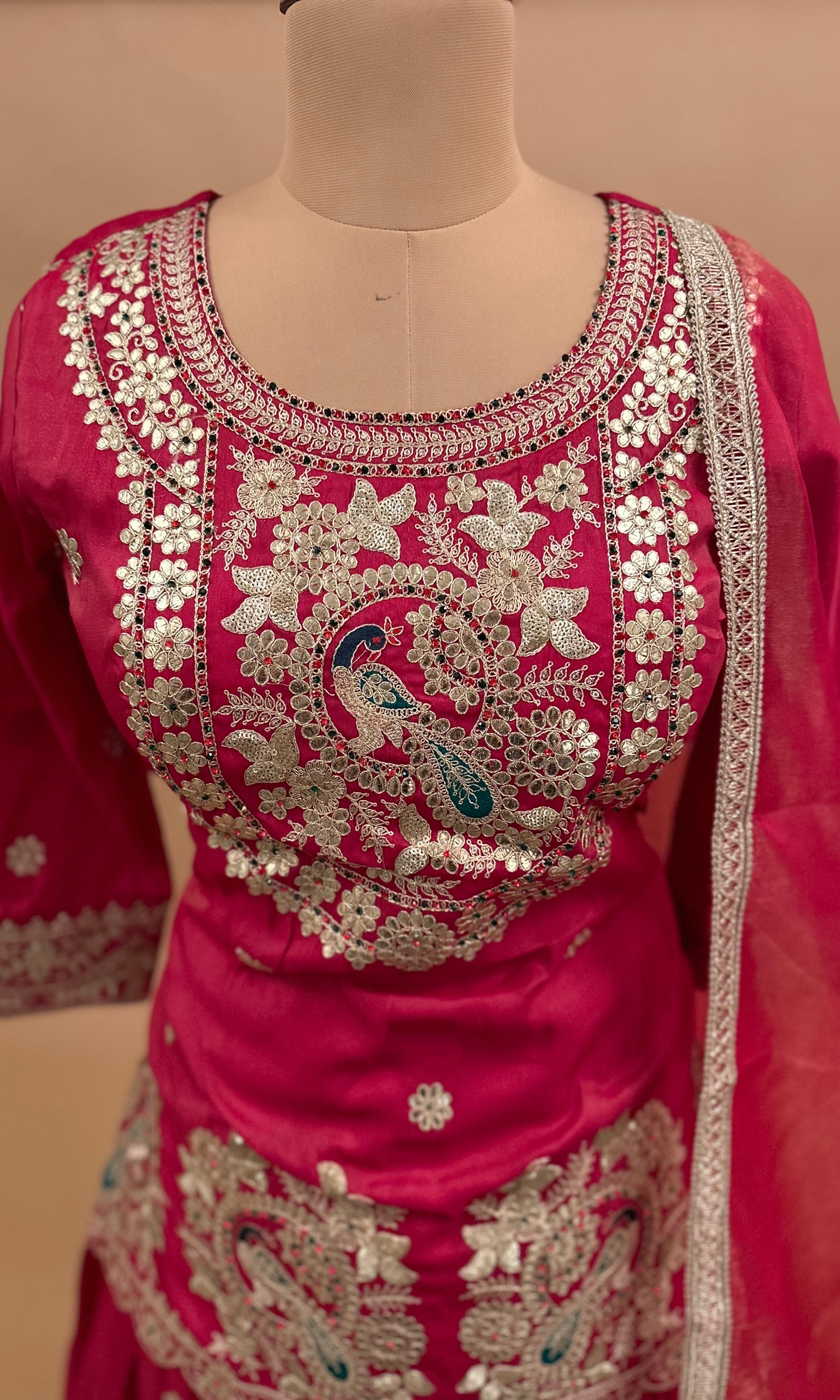 Elevate your wardrobe with this expert-crafted pinkish red outfit featuring an elegant peacock design. The shimmer fabric adds a captivating glow, while intricate Gota Patti and Swarovski embroidery bring luxurious detail. Paired with a matching skirt at the bottom, this ensemble offers both sophistication and grace suitable for special occasions.