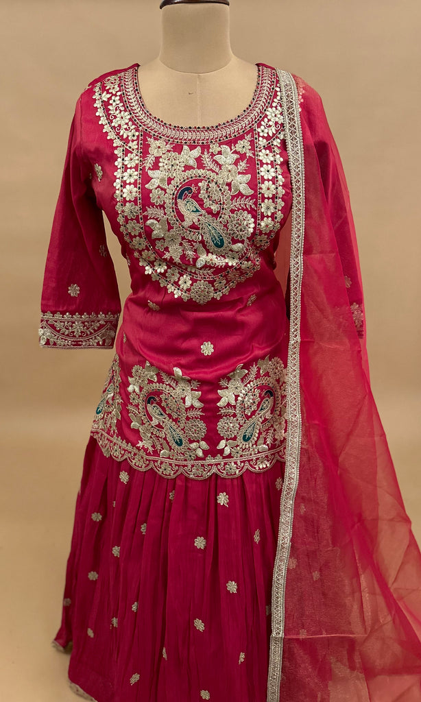 Peacock Design Pinkish Red Color Outfit With Skirt On Bottom