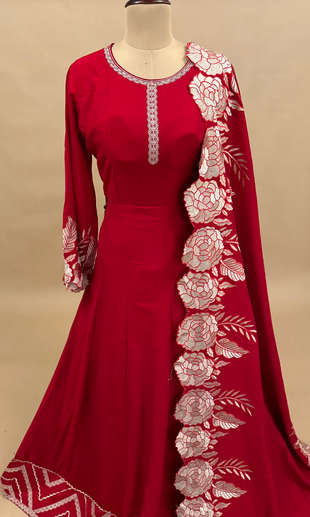 Red Color Long Dress On Premium Silk Fabric With Designer Dupatta