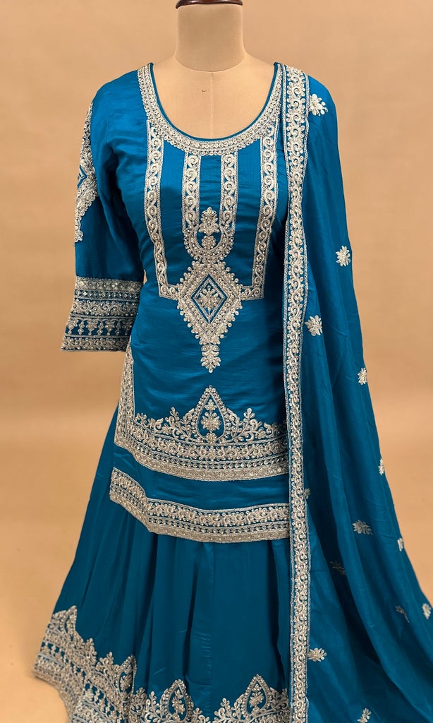 Teal Blue Color On Chinon Fabric Outfit With Skirt On Bottom
