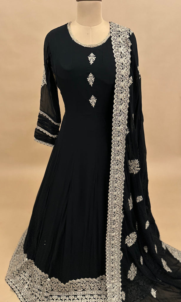 Party Wear Long Dress On Georgette Fabric Black Color With Heavy Dupatta