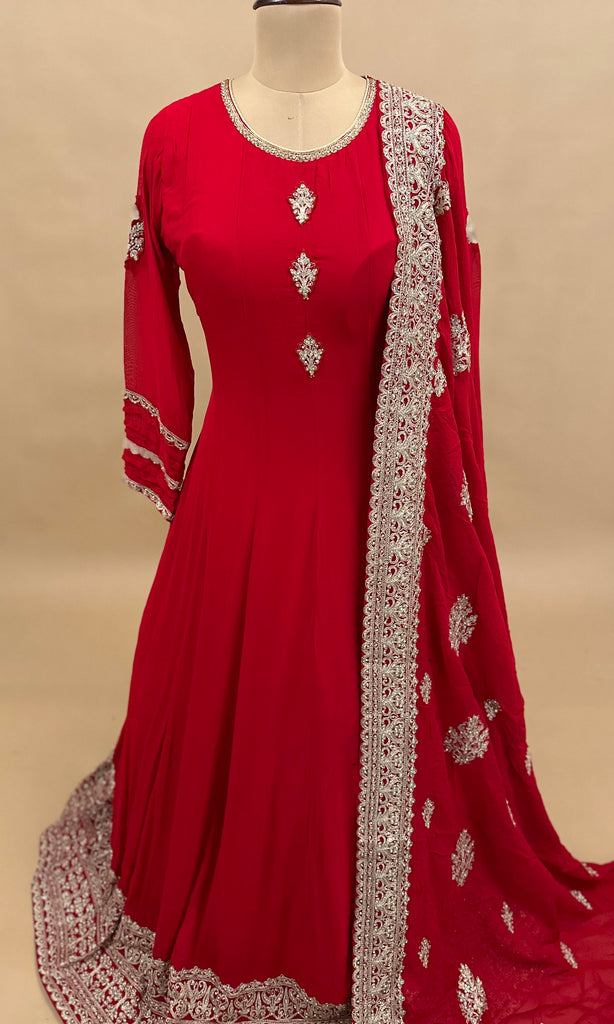Red Color Party Wear Long Dress On Georgette Fabric With Heavy Dupatta