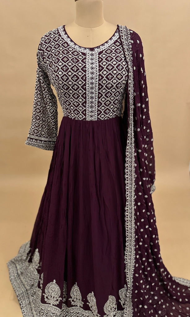 Heavy Stone Work Embroiderey Dark Plum Color Long Dress With Dupatta
