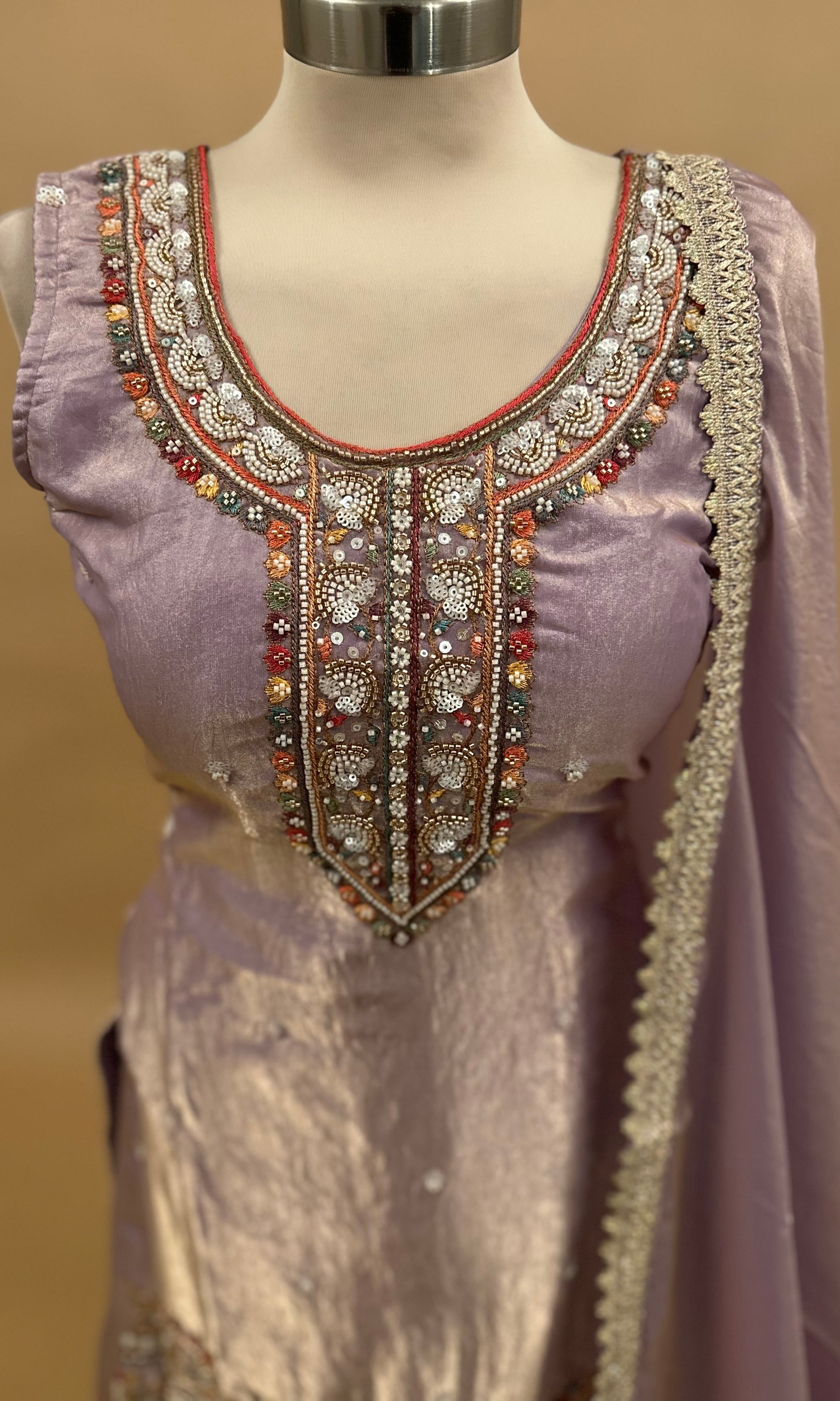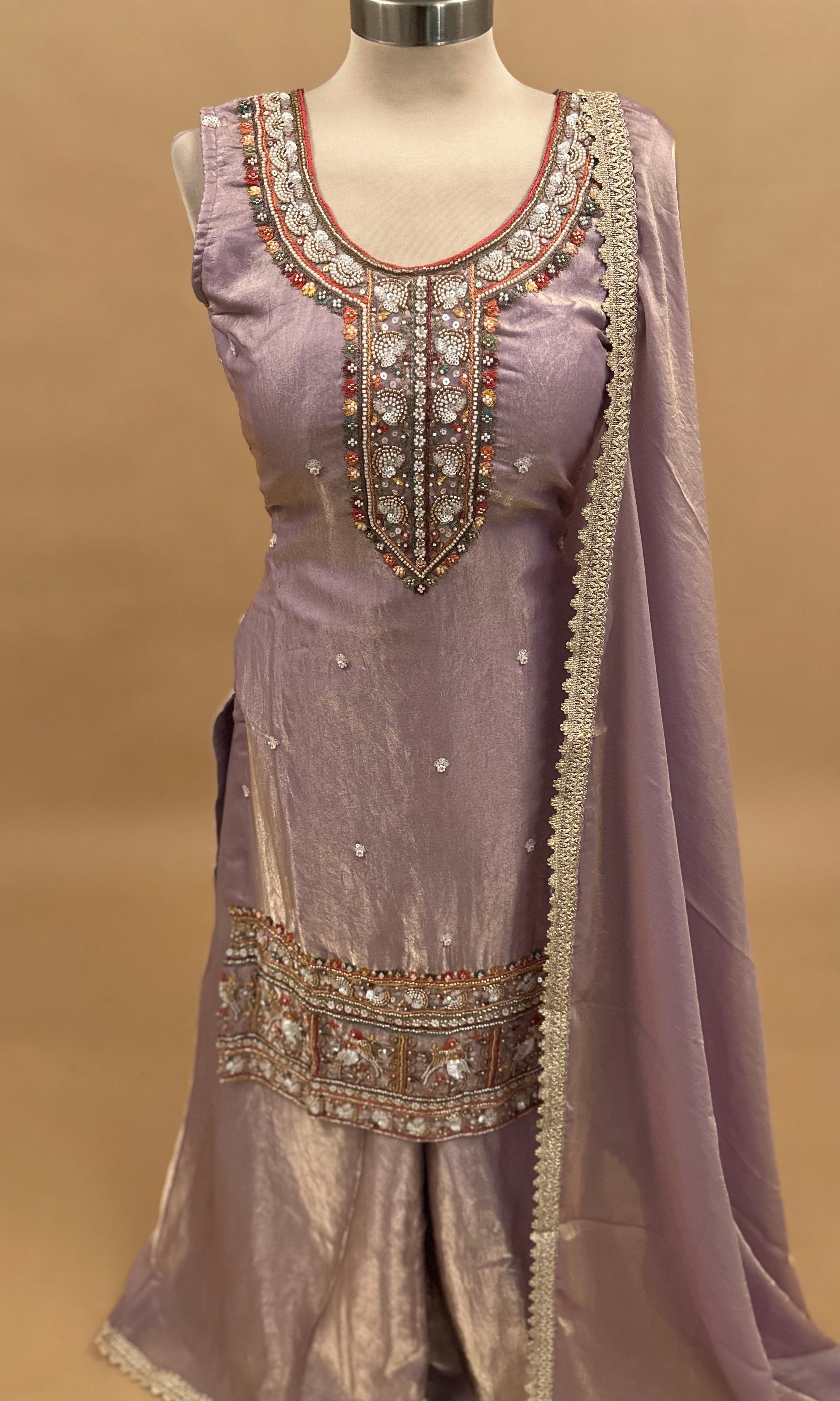 This Purple-colored palazzo suit crafted from lightweight tissue fabric offers both elegance and comfort. Detailed with delicate bead embroidery, it adds a subtle shine that enhances its sophisticated look. The set includes a matching dupatta, completing the ensemble with grace and versatility for various occasions. Ideal for warm weather, its breathable fabric ensures ease of wear throughout the day.