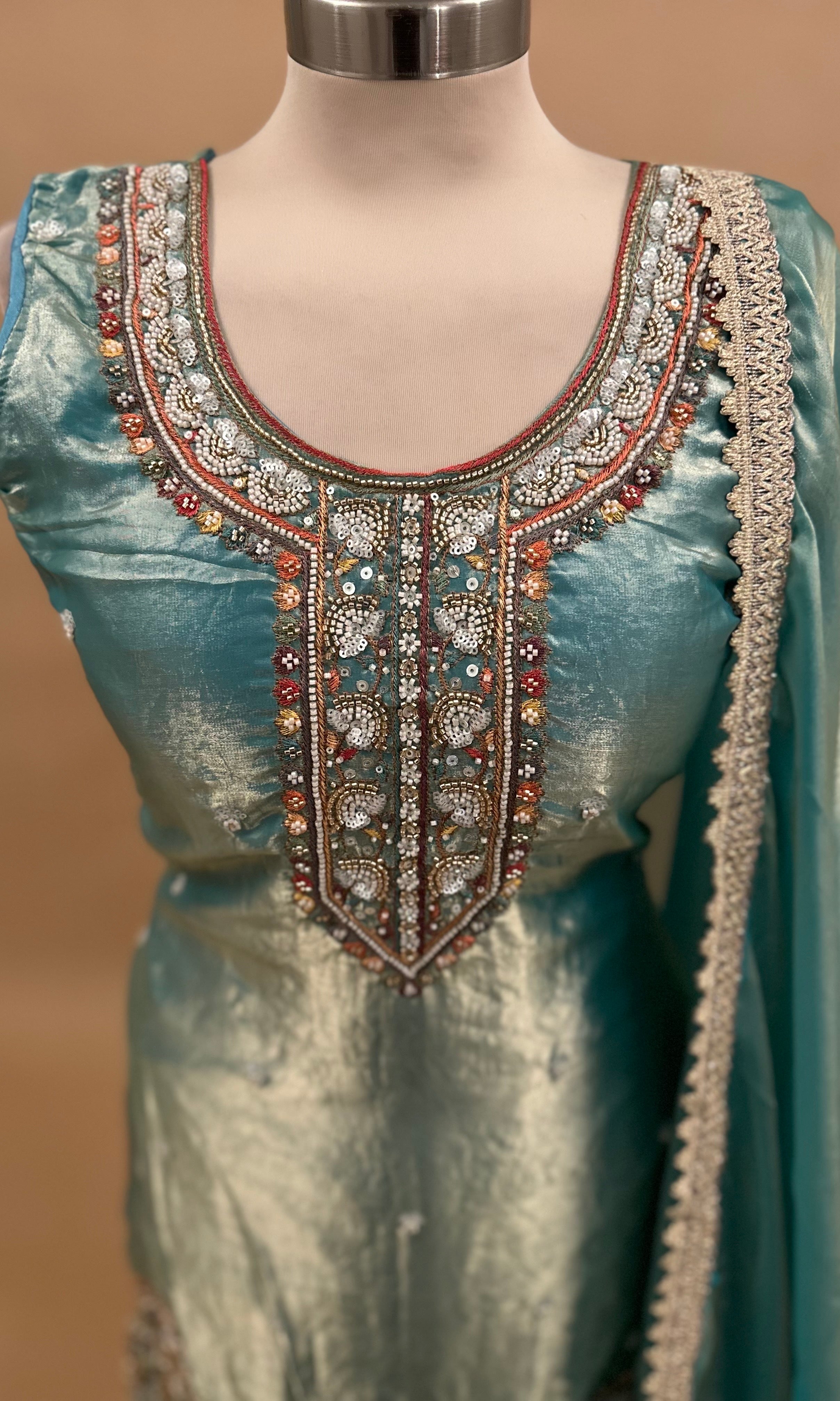 This Teal-colored palazzo suit crafted from lightweight tissue fabric offers both elegance and comfort. Detailed with delicate bead embroidery, it adds a subtle shine that enhances its sophisticated look. The set includes a matching dupatta, completing the ensemble with grace and versatility for various occasions. Ideal for warm weather, its breathable fabric ensures ease of wear throughout the day.