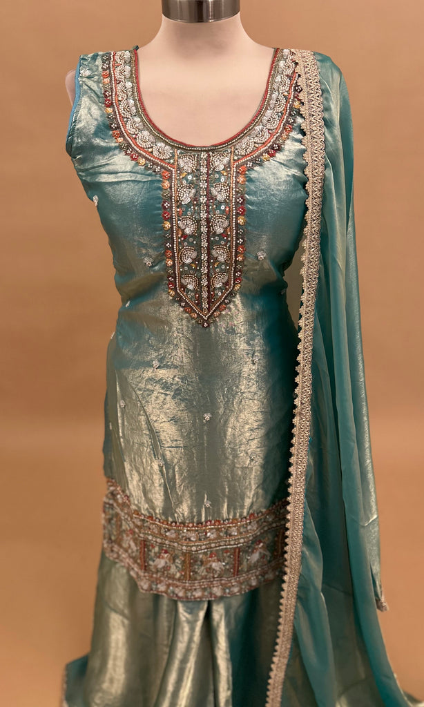 Tissue Fabric Light Weight Palazzo Suit Teal Color With Dupatta