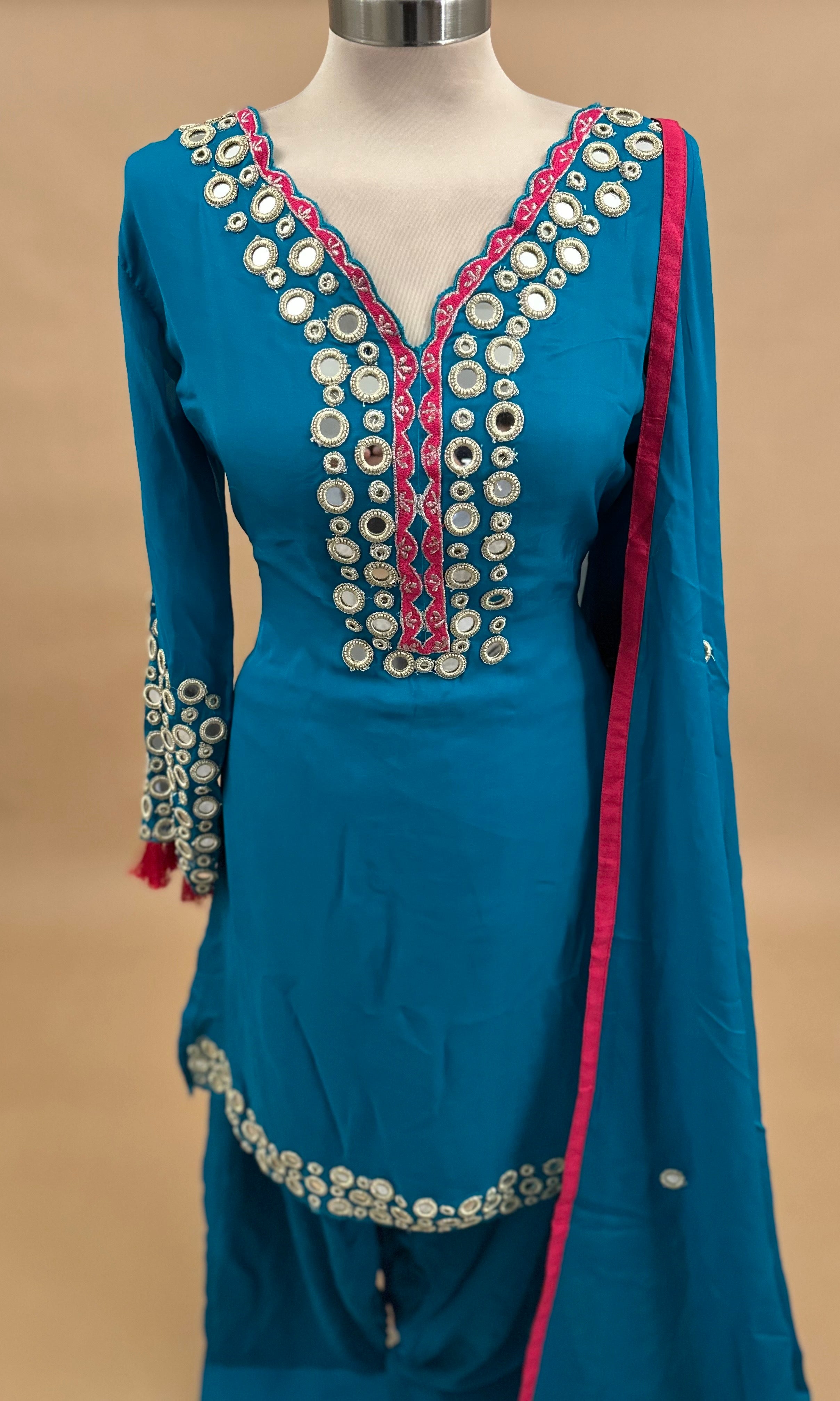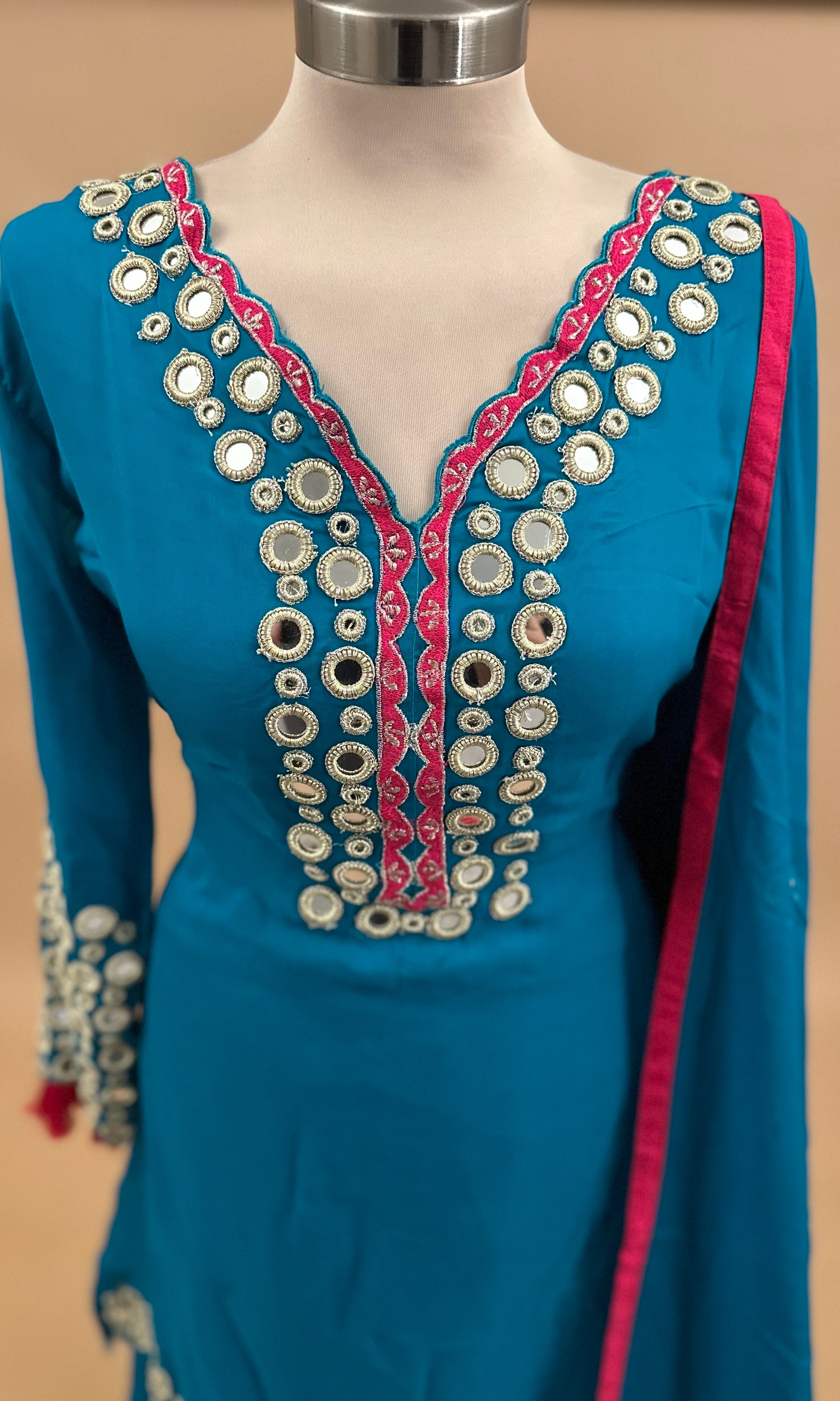 Elevate your festive wardrobe with this stunning blue Dasheen fabric pant suit, expertly crafted for sophisticated occasions. The ensemble features an elegant Farshi silhouette paired with a coordinating dupatta, creating a graceful drape that flatters every frame. Intricate mirror work embroidery adorns the fabric, adding a luxurious sparkle and dimension to your look. The premium Dasheen material offers a refined texture and comfortable wear throughout your celebration. Perfect for weddings, parties, and formal gatherings, this timeless piece combines traditional elegance with contemporary style.