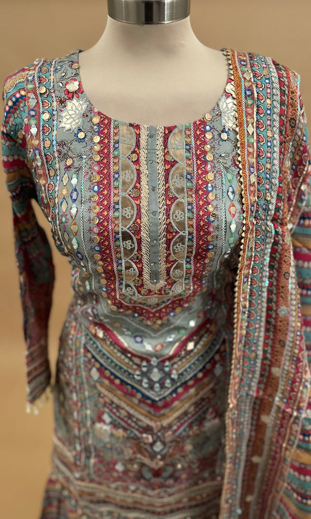 Elevate your ethnic wardrobe with this stunning multicolor Dasheen fabric Sharara suit, expertly crafted for the discerning wearer. The luxurious Dasheen material drapes beautifully, offering both comfort and sophistication. Intricate mirror and sequin embroidery adorns the ensemble, creating a captivating play of light and dimension that commands attention at any occasion. The coordinating dupatta completes the look with grace and elegance. Perfect for weddings, celebrations, and festive gatherings, this traditional silhouette merges timeless design with contemporary flair, ensuring you stand out with refined style and impeccable craftsmanship.
