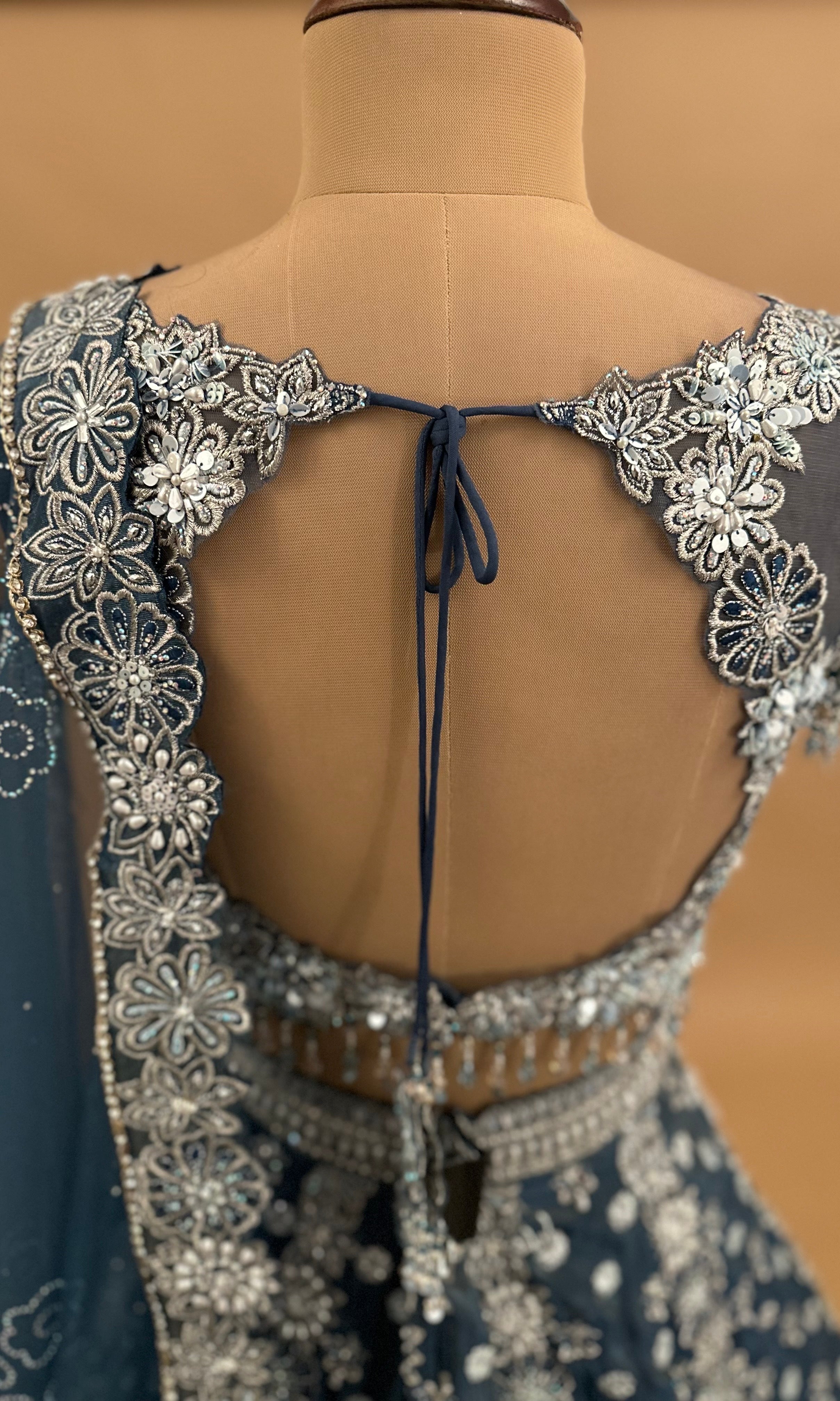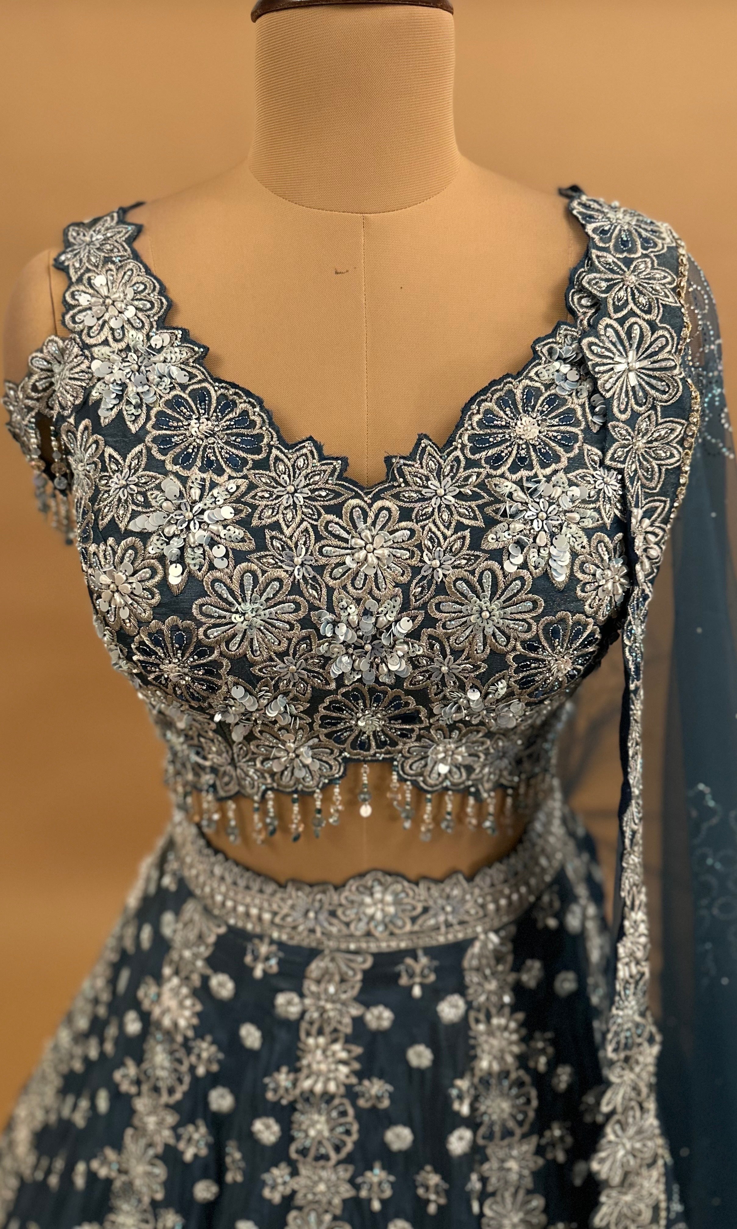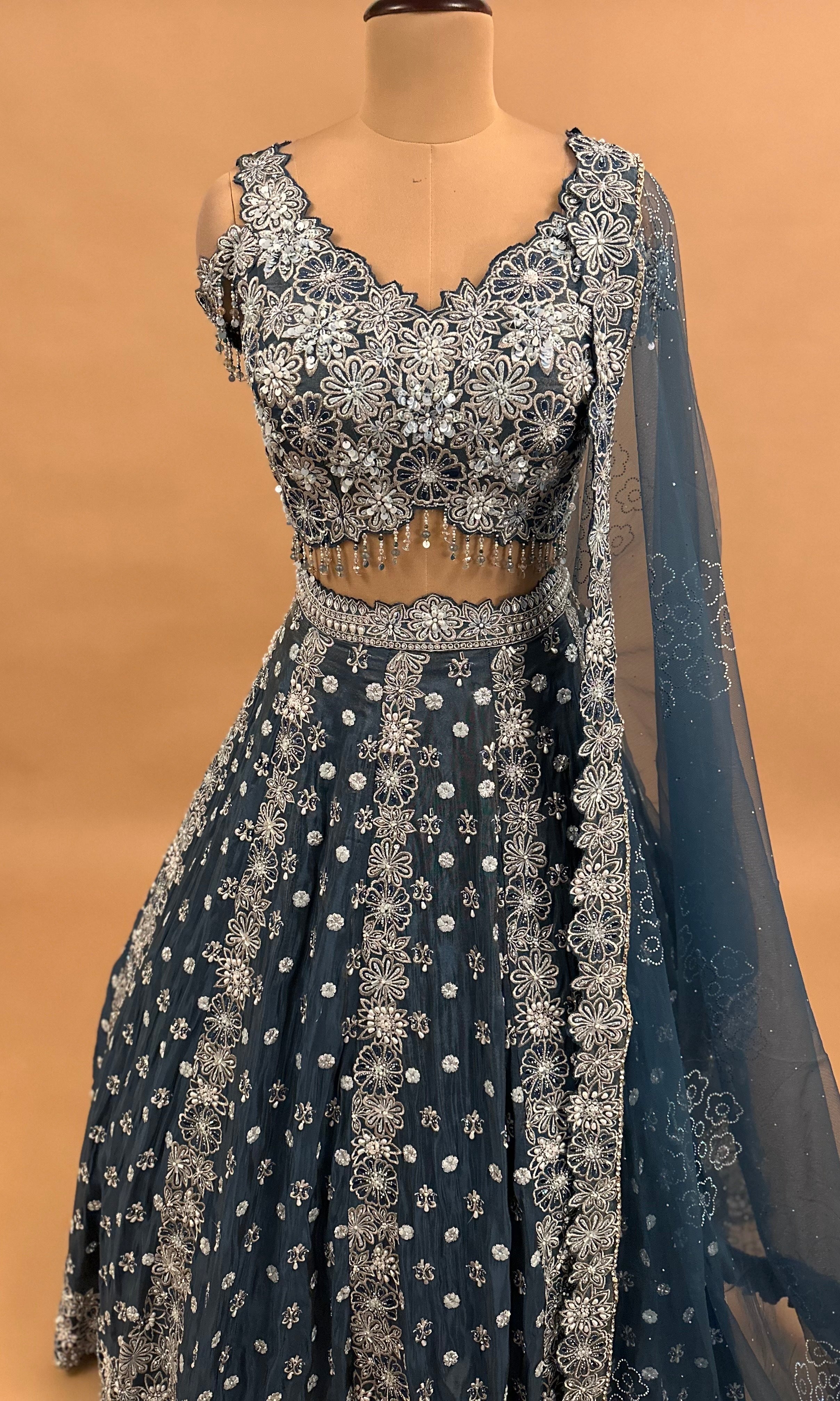 Elevate your ethnic wardrobe with this stunning blue lehenga set, meticulously crafted with intricate pearl and stone embroidery work. The shimmering fabric catches light beautifully, creating an elegant drape that flatters every silhouette. This three-piece ensemble includes a richly embellished lehenga, coordinating choli, and flowing dupatta, making it an ideal choice for weddings, festivals, and special celebrations. The detailed pearl and stone detailing showcases traditional craftsmanship while the luxurious shimmer fabric adds contemporary sophistication. Perfect for those seeking a statement piece that combines timeless artistry with refined elegance.