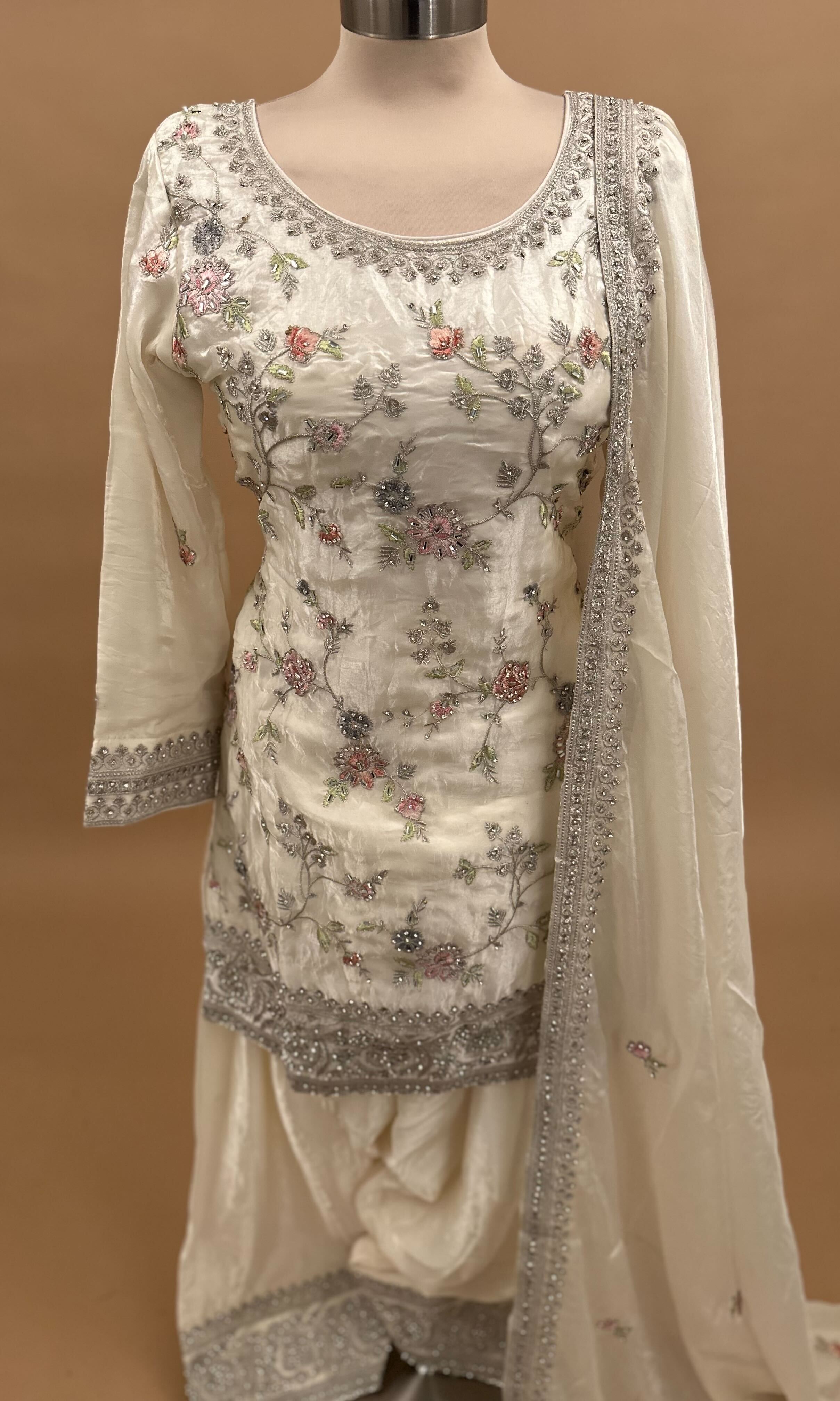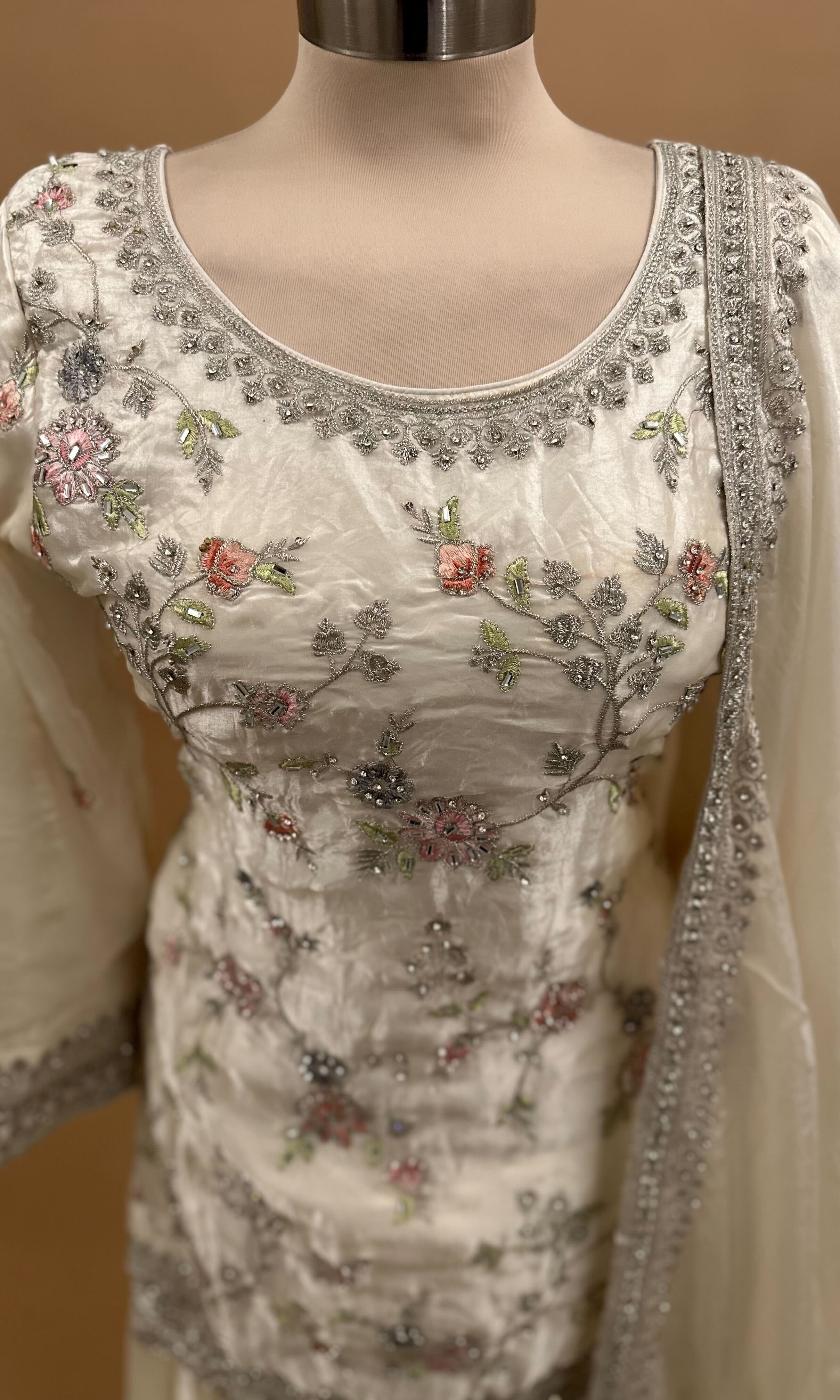 This elegant ivory white Farshi salwar suit features intricate stone work embroidery, adding a subtle sparkle perfect for parties and special occasions. Paired with a matching dupatta, it delivers classic style with a festive touch. Crafted from quality fabric, it offers comfort alongside its stunning design. Ideal for those seeking a refined and eye-catching ethnic ensemble.